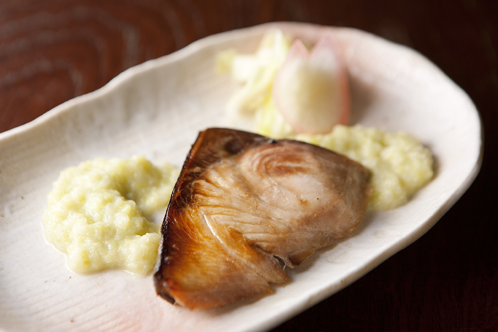(長崎産天然ぶりの山椒焼き 春キャベツの浅漬けとピューレ添え)
